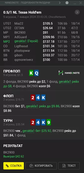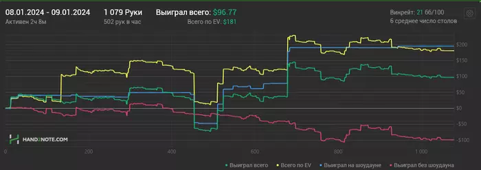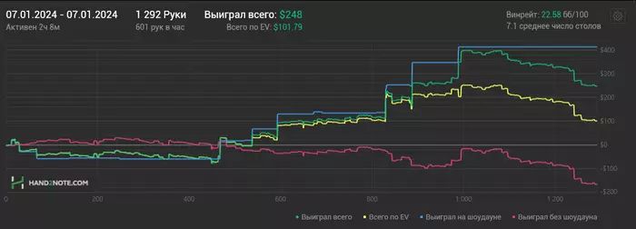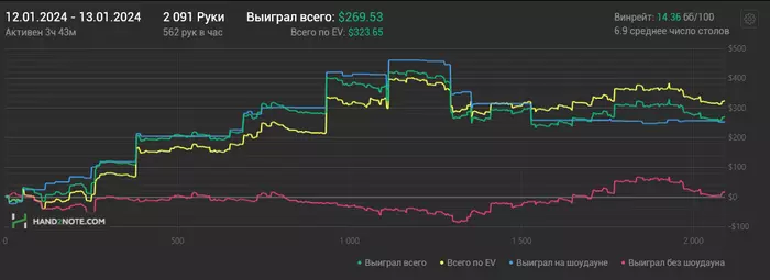 13/01/2024: 3.43ч, 2091 рук nl100 +$252.