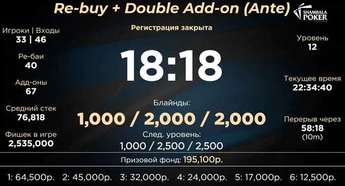 Играю оффлайн кеш 50/100р сейчас в Шамбале. Собрался стол под супервипа, который начал всех собирать сразу же, я залил ему 20к в двух раздачах. Из больших банков дальше - выставился на 30к с ним один раз в сквизпоте с против его на борде , две доски, поделили. Потом я сыграл лимп-3бет баттон страдла в утг до 7.5к с , он изи колл на , на борде он в меня поставил донк олын, выставились опять по 30к, две доски, поделили. И после этой раздачи он встал со стеком 50к+, садился с 10к.