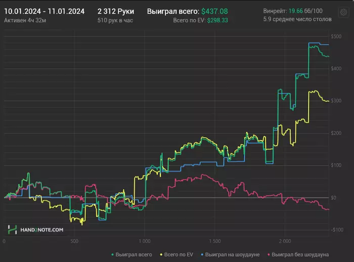 10/01/2024: 4.32ч, 2312 рук nl100 +$511.