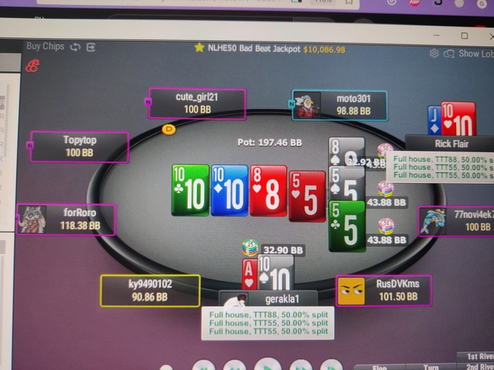 Днём доволен. Играл не прям идеально, но ещё и жарили, и дважды покерный клиент намертво вешал комп по ходу сессии, но я не поплыл, отбил сессию в ноль и закончил. На скрине выставился с фишом на тёрне, три борда поделили 😂