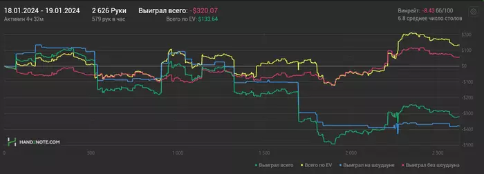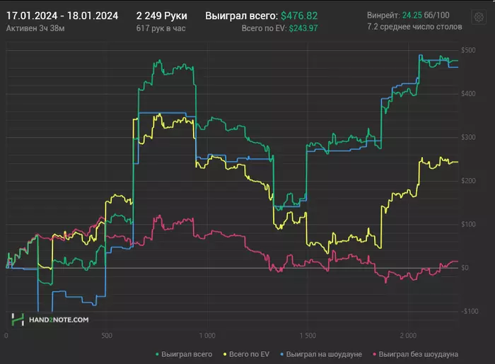 18/01/2024: 3.38ч, 2249 рук nl100 +$472.