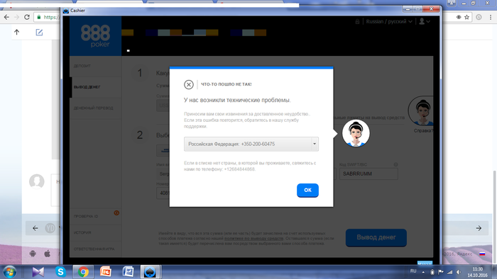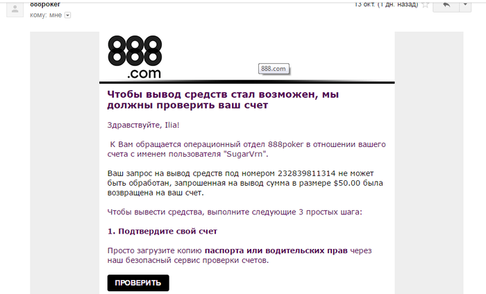 Писал и на support@888poker.com и на operations@cassava.net. Говорят, что все хорошо - можно выводить, а вывести не получается.
