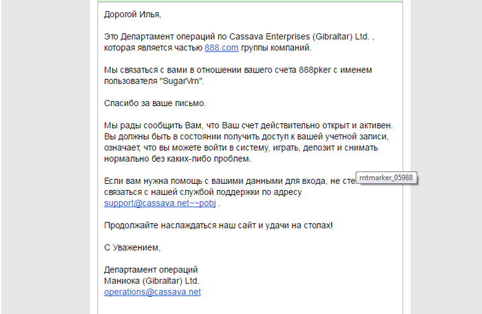 Если останутся еще какие-либо вопросы на этот счет, пишите свой ник на 888poker, чтобы я связал вас с менеджером.
