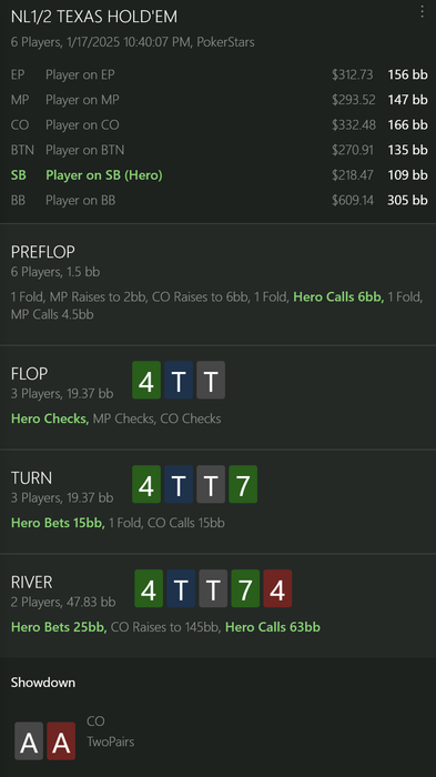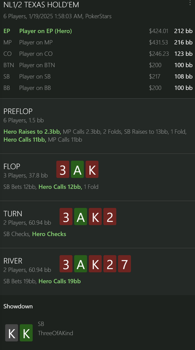 Пропустить ставку на терне тут тоже так себе решение — солвер бы наверняка поставил треть. Я бы точно поставил. И поставил бы больше на флопе (возможно, SB сам сыграл флоп и терн, а потом решил подсмотреть ривер?).