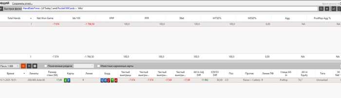 Добрый день! Установил версию с триалом. Сыграл такую раздачу - был оупен 2,5ББ и колл, я запушил АКо. Один отвалился, второй кол с АQo. Я поехал старше и проиграл. Но программа посчитала EV раздачи -1768,5 bb /100. Как так, ведь я поехал старше? Или я неправильно понимаю этот показатель?