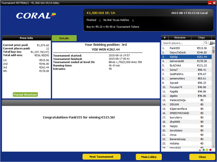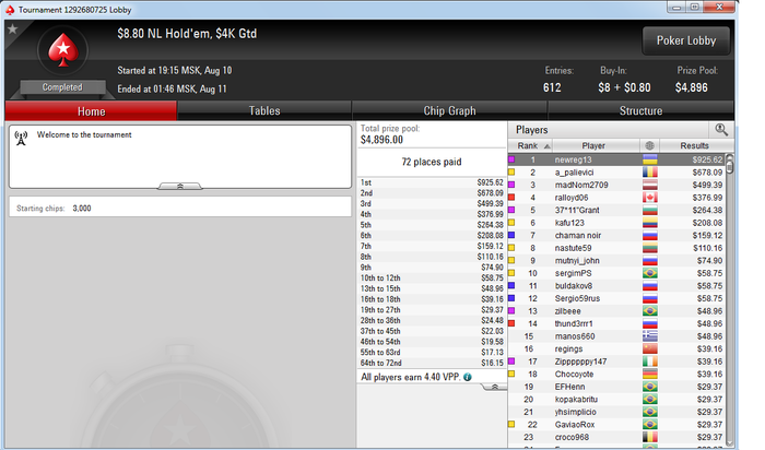 Вот и небольшой банкролл на WCOOP. Жаль, финалка не сложилась. Но 4й из 3461 тела - нормал!) С телефона, без ХМ, в чайхоне, при поддержке друга. El Classico.