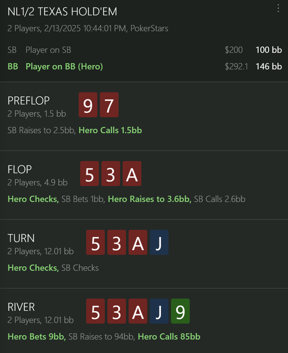 Если у него высокая черва, то выйдет слишком уязвимая линия на червовом ривере - там останется только чекать или ставить блок. Разве что овербет терна можно было сыграть, но не выглядит как макс EV на дистанции совсем.
