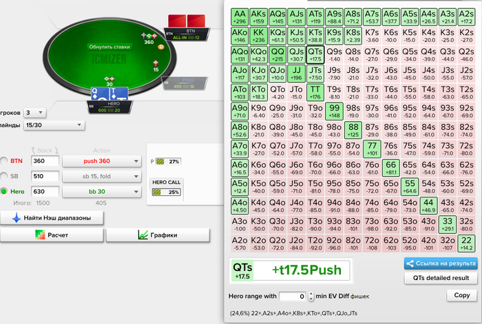 Hero raises to 17.5 BB and is all-in,