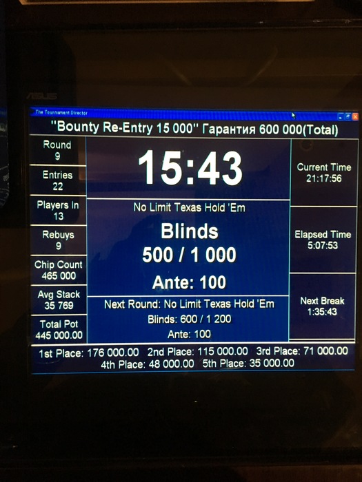В 16:00 начался турнир Bounty ReEntry по 15 000 руб Сейчас начало второго уровня, за столами 14 человек Поздняя регистрация и возможность сделать ReEntry до окончания уровня #8 Длительность уровней по 30 мин Гарантированный призовой фонд 400 000 + 200 000