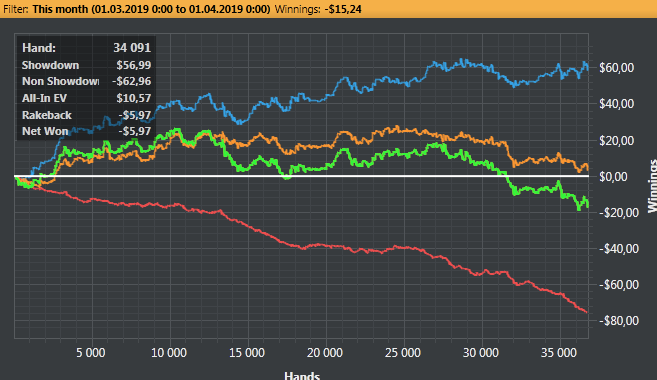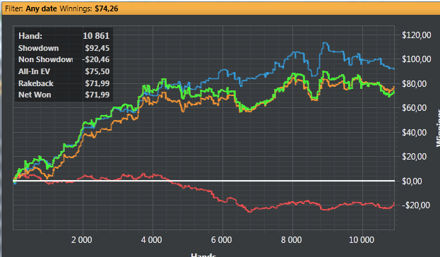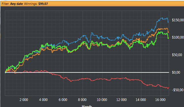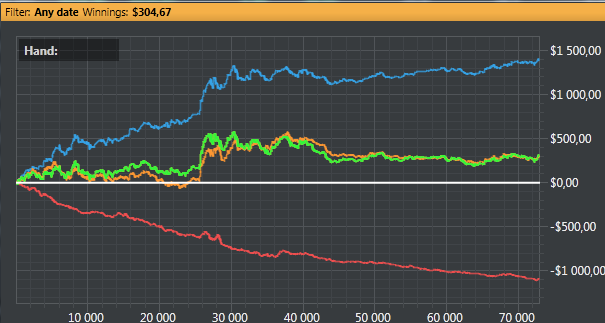 Что то пока непонятно. Вроде и 13бб/100, но 7к в ноль удручают. Ладно, будем считать что дистанция никакая пока. Я помню графики Filjgh по 50к в минус во время его марафона. И нл5 играть это жуткая тягомотина. Привык повыше