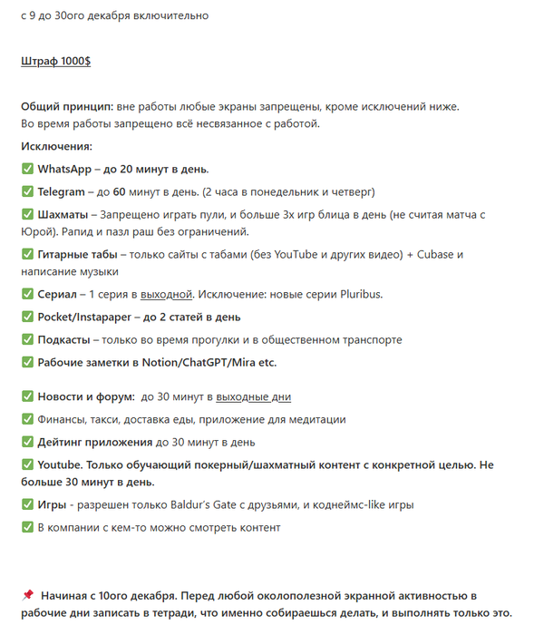 2) с утра, как проснулся, первые 10-15 минут без телефона. как ни странно, изредка начало удаваться почти с самого утра сесть и что-то посмотреть/углубиться по работе. Когда начинал с телефона, такого желания не было никогда.
