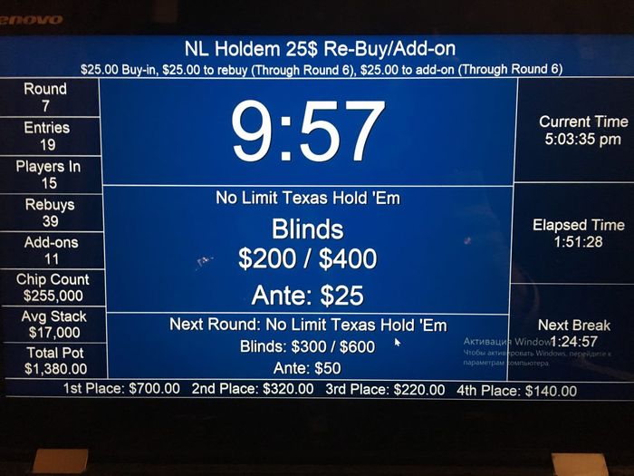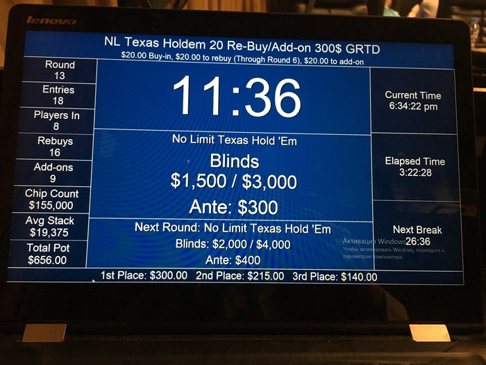 Привет! Структура очень жесткая просто 300-600, 500-1000, 700-1400, 1000-2000, 1500-3000 это как бы за полтора часика происходит, после аддона через час у всех по 5-10бб и чисто в лото играем. Собираетесь что то менять в структуре и стартовых стеках?