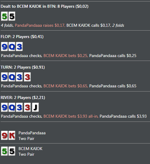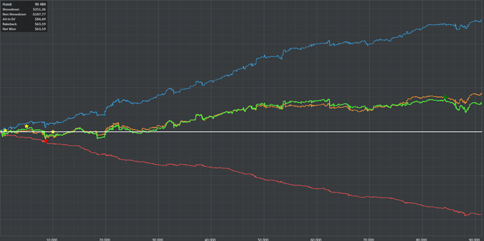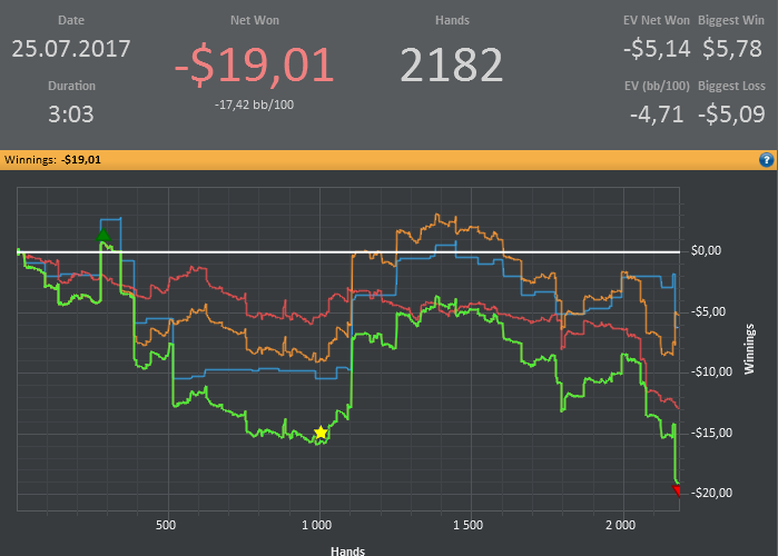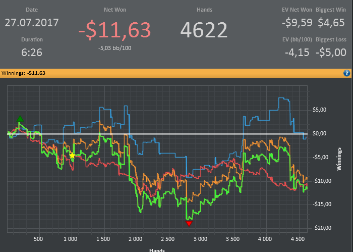 а еще мне стало скучно играть на двойках, а на пятерке выстрелить не получается, и хуй знает что делать, как говно в проруби болтаться до 110 и обратно? так себе перспективка. тут все дело в том, если что то не выходит, то сидеть и задрачивать до талого не мое, интерес только к деньгам, а переехал я там кого или знатно блефанул мне до лампочки, и когда денег не становится больше, мне становится не интересно. а если мнительность моя на первое место вылезает, с мыслью, какого хуя эти ебливые три аута докручиваются, тут желание участвовать в наибалове и вовсе нет. вот такая хуета. пойду попью чайку, и играну еще раз, тильта как такового нет, потому что морально готов что больше не даст, есть еще пару би на пятерки, если и их укатают, либо пас, либо двойки, там по настроению.