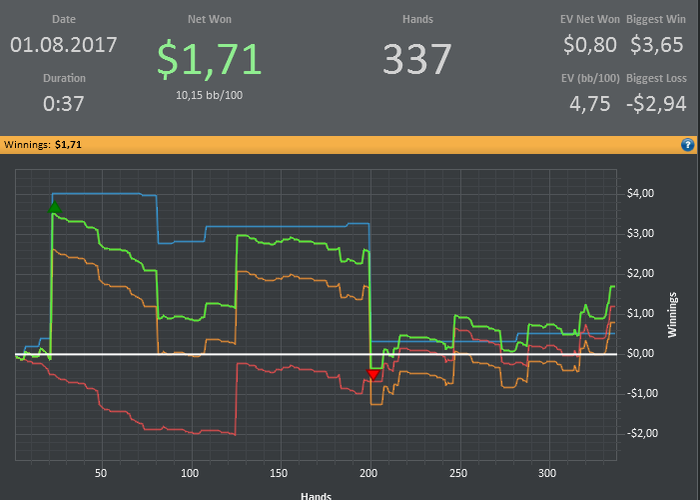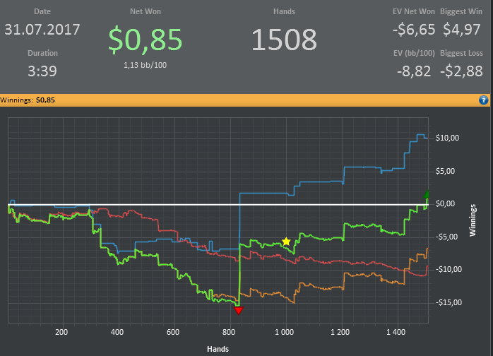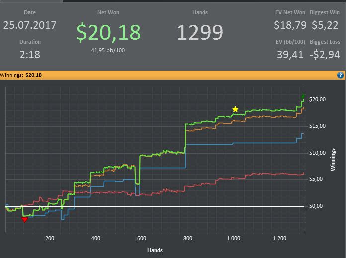 diman, вот, блядь, что заебывает желтая и зеленая а еще мне стало скучно играть на двойках, а на пятерке выстрелить не получается, и хуй знает что делать, как говно в проруби болтаться до 110 и обратно? так себе перспективка. тут все дело в том, если что то не выходит, то сидеть и задрачивать до талого не мое, интерес только к деньгам, а переехал я там кого или знатно блефанул мне до лампочки, и когда денег не становится больше, мне становится не интересно. а если мнительность моя на первое место вылезает, с мыслью, какого хуя эти ебливые три аута докручиваются, тут желание участвовать в наибалове и вовсе нет. вот такая хуета. пойду попью чайку, и играну еще раз, тильта как такового нет, потому что морально готов что больше не даст, есть еще пару би на пятерки, если и их укатают, либо пас, либо двойки, там по настроению.