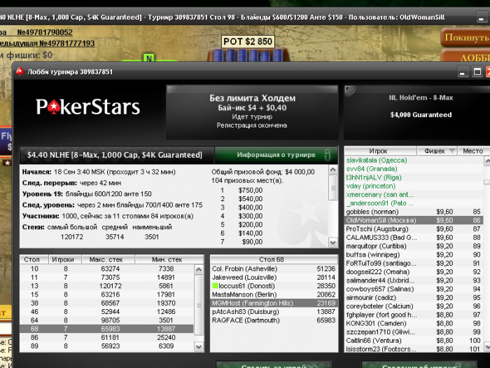 Poker Stars $4.00+$0.40 No Limit Hold'em Tournament - t300/t600 Blinds + t70 - 8 players -
