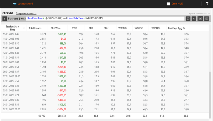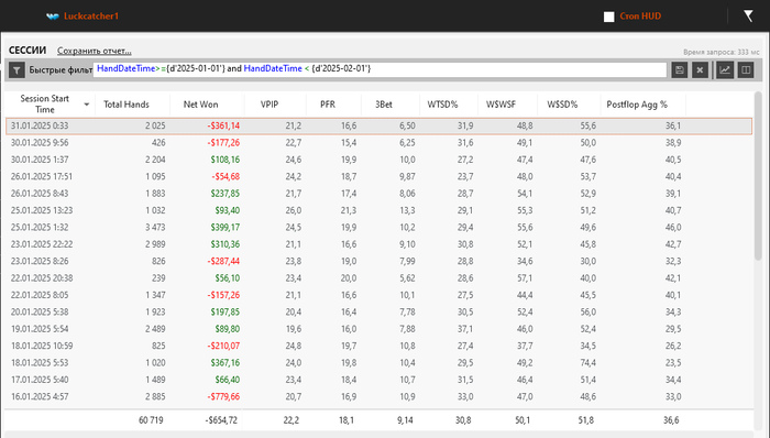 Январь начал с жирного минуса. Первая сессия - 2-го января - минус 9 БИ. И весь месяц по сути боролся за то чтобы выйти в ноль - не удалось. Откатал 60к рук.
