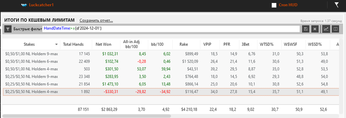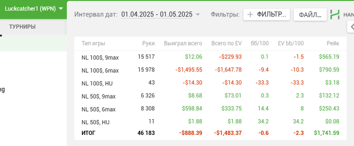 31-го катал 6 столов нл100 - минус 3,5 БИ. Теперь переключусь на нл50 - это будет моя основная загрузка, пока не восстановлю БР до $5к, или около того. 9макс нл100 оставлю в загрузке.