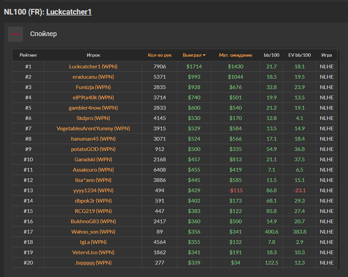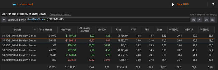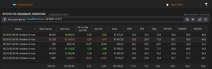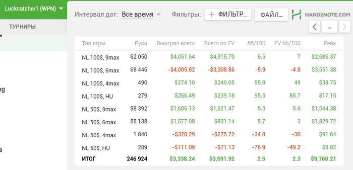 В целом получается окей. Бустанул вр на 9-макс нл100. Только для меня пока остаётся загадкой - почему такая разница в профите с 6-макс нл100. Да, прослеживается общий тренд - 9-макс выгоднее. Посмотреть тот же нл50. Но поражает разница именно на сотке. Надеюсь когда-нибудь с этим разобраться. И, возможно даже, вывести в ноль этот 6-макс.