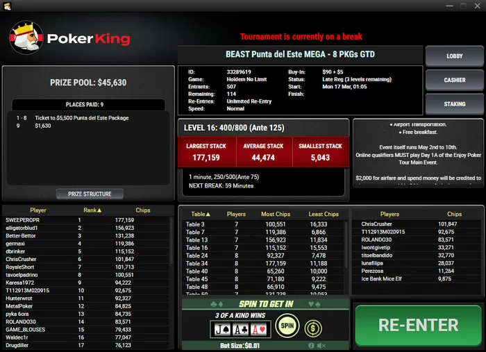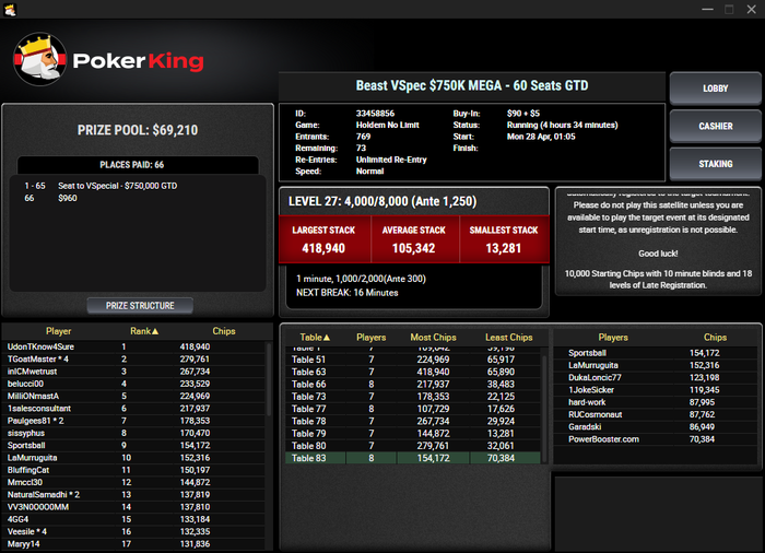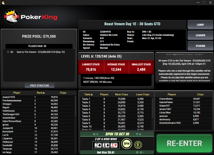 Beast Venom. Во всех бист-туриках я так понял всегда один и тот же формат. 8-макс, блайндс ап 10 мин, поздняя рега 18 уровней, безлимитные ре-энтри, старт стэк 83 ББ.