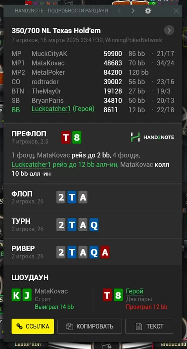 К первому брейку подошёл на 10-м месте из 346. Ко второму брейку был на 23-м из 167. Далее стэк быстро и незаметно стал средним. Потом префлоп оллин с коротким стэком ВВ вс АК. И вот у тебя уже 12 ББ пуш-фолд.