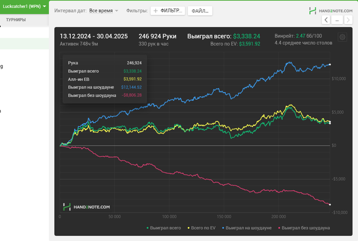 Не все раздачи затрэкались с турика. Теперь и с х2н3 стали происходить разные необъяснимые вещи. Последние пару дней руки импортируются с задержкой, которая постепенно увеличивается. И даже после закрытия столов, если оставить клиент рума и х2н3 открытыми, руки продолжают догружаться в трэкер. Это было 3 раза проверено мной лично. После двух часов катки, ещё час минимум держишь открытым лобби с трэкером, чтобы загрузились недостающие руки. Надеюсь, скоро этот вопрос решится.