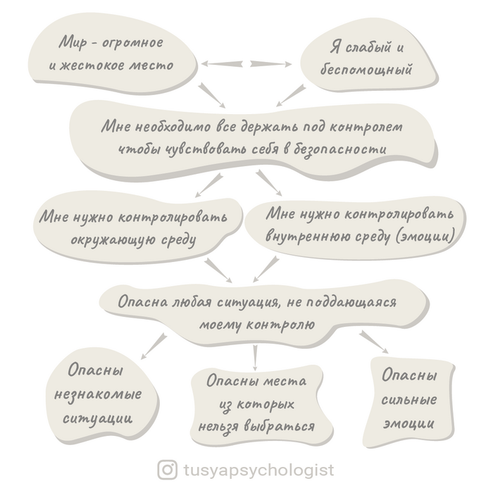 В общем, если ваши мысли часто похожи на схему выше, мы можем предположить, что в вашем детстве происходило много вещей, которые доказали вам, что мир – это огромное и небезопасное место. А постоянная тревога и умение «держать себя на взводе» скорее всего иногда выручали, чем только укрепили ваше в веру в то, что это единственная правильная стратегия.