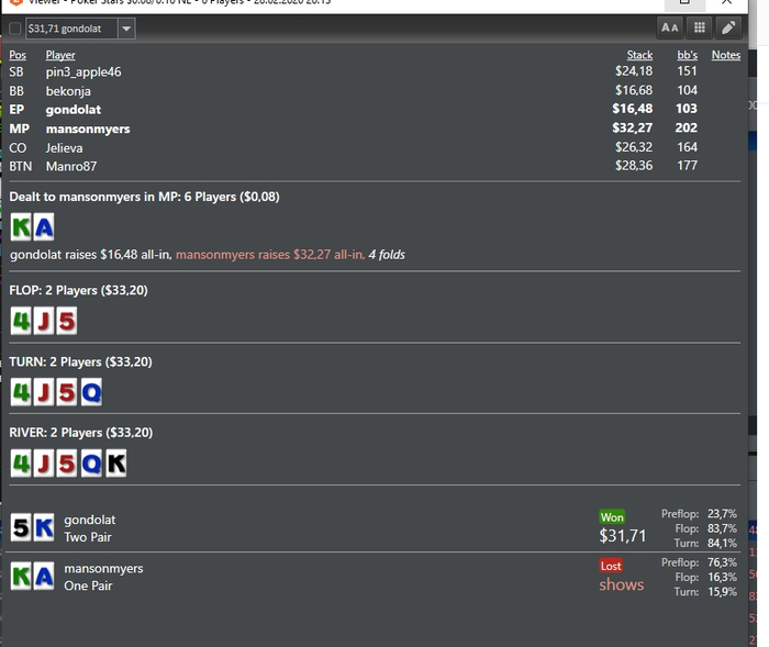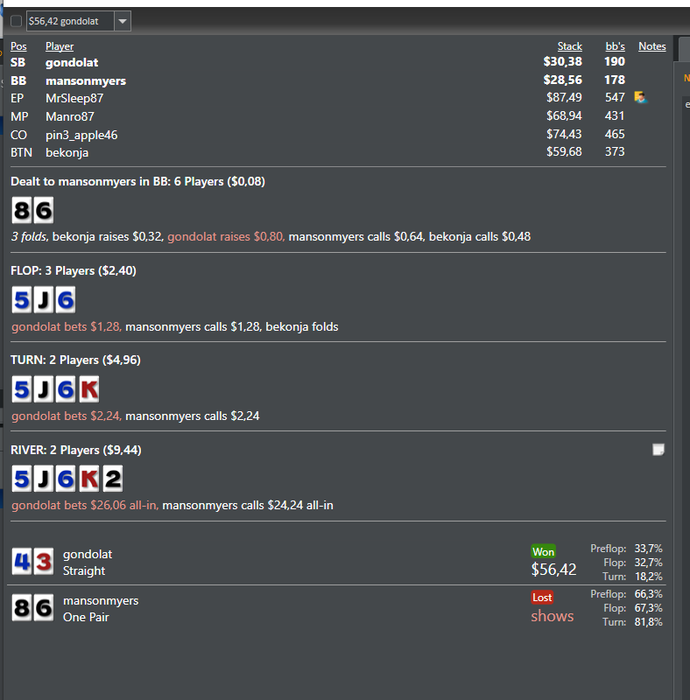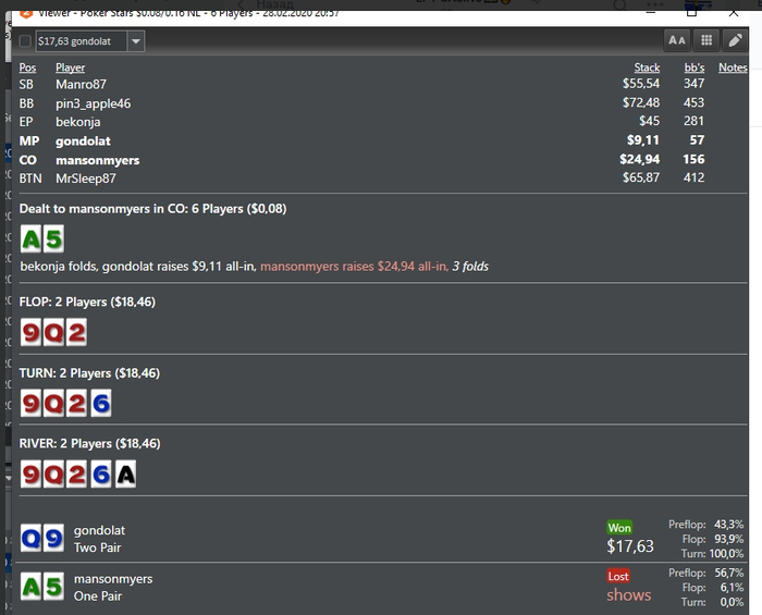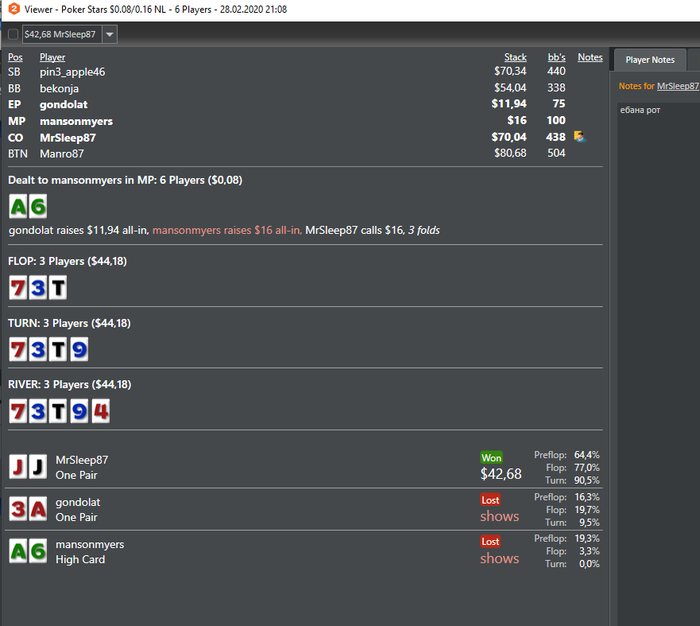 Первые 3 цифры впип/пфр/3bet, пушит или опенрейзит 10бб+ каждую руку. Человек за 124 руки залил 18 стеков)) Вот парочка раздач: