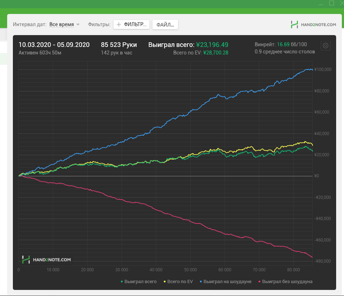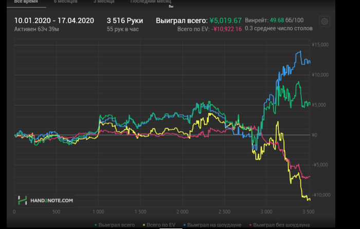 Смотря на график можно подумать что вроде все збс, но это не так, т.к. средний винрейт аллиаса фонда, от которого я играл примерно 25-30бб, т.е. у меня по факту намного меньше чем у других регов, плюс из-за того что я играл один лимит, выходило очень мало рук в час, что является наверное главной проблемой китая и все винрейты об это разбиваются, у меня просто не получалось больше рук в час катать, т.к. либо тупо нету игры, либо все столы с тимплеем.