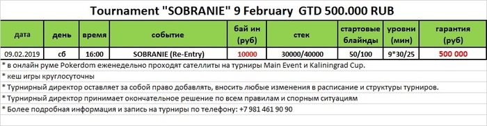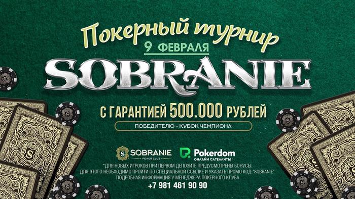 Дорогие друзья! Ну наконец то и с радостью мы готовы анонсировать наши покерные мероприятия! Итак, нас ждёт в ближайшее время следующее покерное событие: 1) 9 февраля в 16:00 однодневный турнир "SOBRANIE" с гарантией 500.000 рублей.