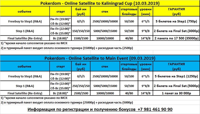 Напоминаем Вам, что для новых игроков при первом депозите предусмотрены определённые БОНУСЫ: 1) Депозит на 1500р - билет на финальный сателлит за 1250р. (SOBRANIE) 2) Депозит на 2000р - билет на финальный сателлит за 1500р. (Kaliningrad Cup) 3) Депозит на 3000р - билет на финальный сателлит за 2500р. (Main Event) 4) Депозит на 6000р - билеты на все 3 финальных сателлита. Для регистрации и получении бонусов, прежде необходимо связаться с менеджером покерного клуба! +7 981 461 90 90 (звонок, what's app и viber)