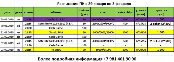 Дорогие друзья! Расписание ПК 15-20 января. Обратите внимание, что во вторник состоится турнир по дисциплине «Omaha PL R&A» по 30 у.е. Гарантия 1000 у.е. А каждую среду и субботу, мы вновь возобновляем сателлиты на мартовскую мини серию с гарантией более 2 млн рублей! Основные турниры пройдут: 9 марта «Main Event» по 25000р. Гарантия 1 000 000 рублей. 10 марта «Kaliningrad Cup» по 15000р. Гарантия 700 000 рублей. Полноценный анонс серии будет в ближайшее время. Ждем всех желающих!