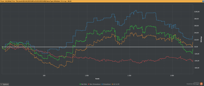 Hero (CO): 44.5 BBBTN: 32.6 BB (VPIP: 40.00, PFR: 0.00, 3Bet Preflop: 0.00, Hands: 7)