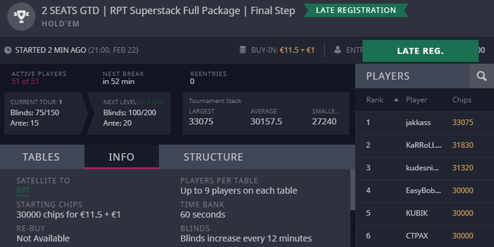 В предфинальном сателлите к RPT Superstack Event Full Package с байином 2.2 евро идет поздняя регистрация. Пока 39 зарегистрированных участников, 34 продолжают борьбу за 10 путевок в сегодняшний финальный сателлит. Поздняя регистрация - до 15 уровня включительно. Регистрируемся.