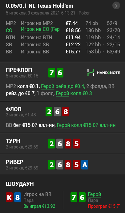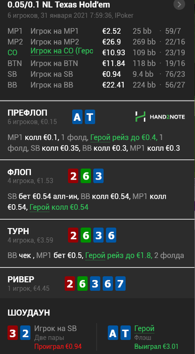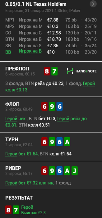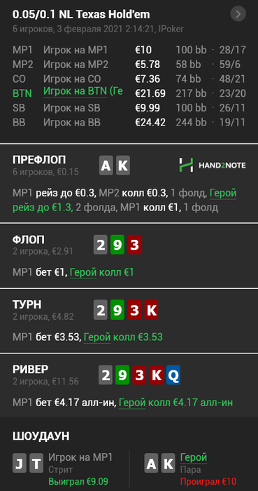 Nik_old @ 30.1.2021 Надо префлоп фолдить, на сколько знаю по "стандарту" эта рука не разыгрывается на sb vs mp