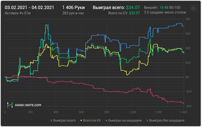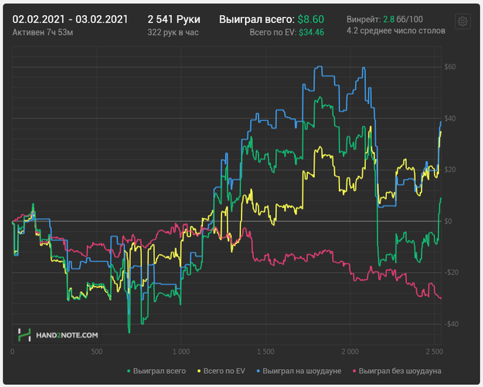 toa @ 1.2.2021 Тут с разных углов можно посмотреть. Конечно много раз бывало когда я довольно много винрейта делал именно на вот этих последних сверхурочных столах))) Но на самом деле, хрен с этим ожиданием на лимитах нл10-25 ))) это те лимиты где можно найти игру просто в любое время суток в любом руме, кроме может быть восьмерок, там часто днем на нл20+ столов тупо нет. А так сидишь долбишь 1-2 стола выигрываешь по итогу например 15-20 баксов и потом режим съезжает дико(если он конечно есть хахах) что ты потом 2-3 дня не можешь к нему вернуться, если вдруг оно прямо надо)