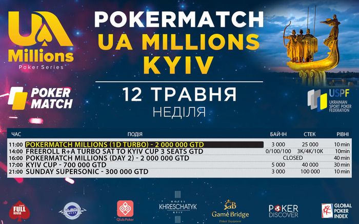 План на воскресенье, 12 мая Отличный и насыщенный событиями ждет нас денек. В 11:00 стартует заключительный турбо-флайт 1D турнира PokerMatch Millions (регистрация будет открыта с 10:00). Дальше в 14:00 начнется фриролл-сателлит в турнир Kyiv Cup. В 16:00 все прошедший в Day2 спортсмены продолжат борьбу за призы в PokerMatch Millions. Всех, кто хочет побороться за главный кубок Киева, в 17:00 ждем на старте турнира Kyiv Cup! И, наконец, завершит нашу программу воскресенья в 21:00 бодрый турбо-турнир Sunday Supersonic! Пошумим!