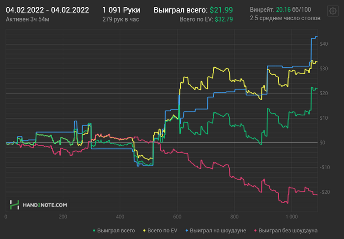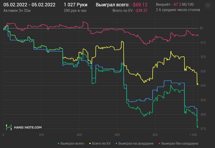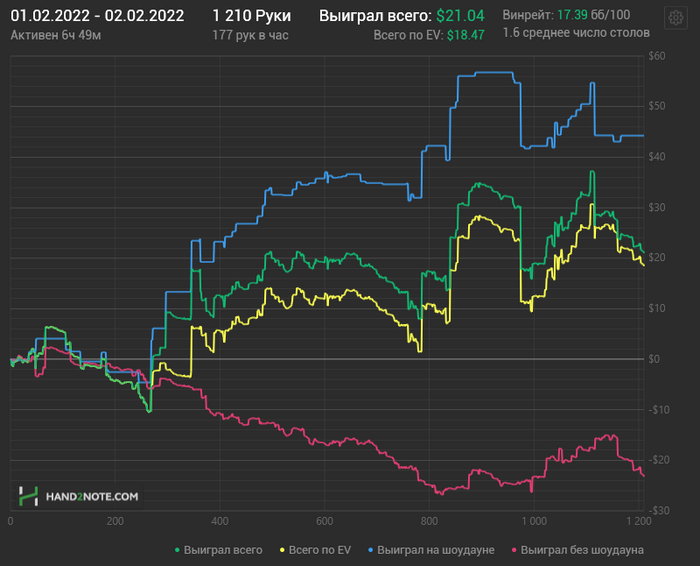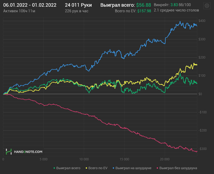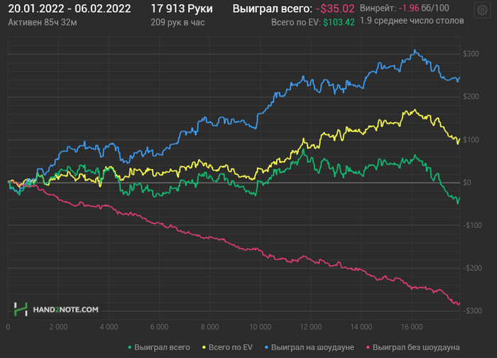 Haldyr_1933, тут от стратегии зависит, и от агрессии. Но в целом, если она летит вниз - это еще не показатель, что ты не будешь плюсовать. У меня где то был скрин, врятли найду, с форума, где игрок на дистанции примерно 100к рук показал график, в котором красная летела как раз таки вверх, но вот по ев и зеленой, да и синей было понятно, что человек играет в минус. Хотя и красная вверху.