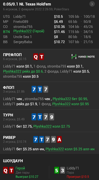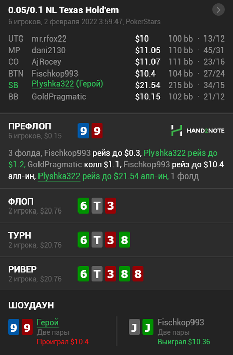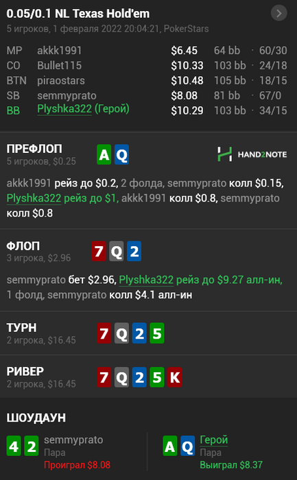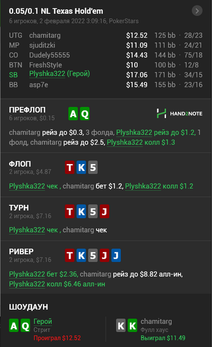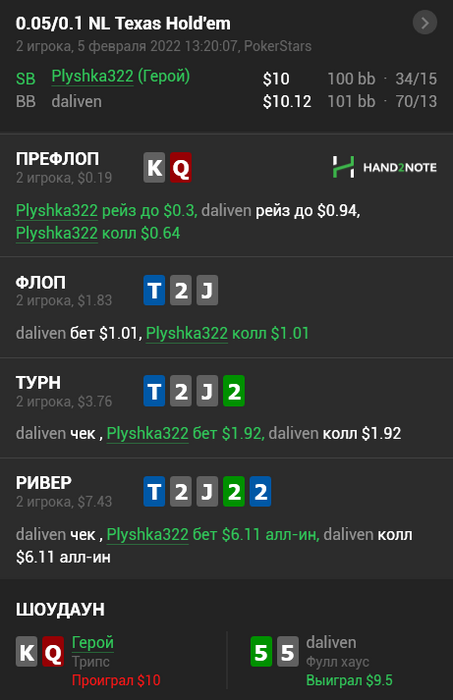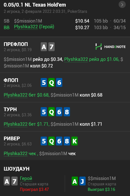 1. Вот такой плохой колл на ривере от меня. Думаю, терн надо было крупно донкать. На ривере не справился с фолдом, хотя и надо было: