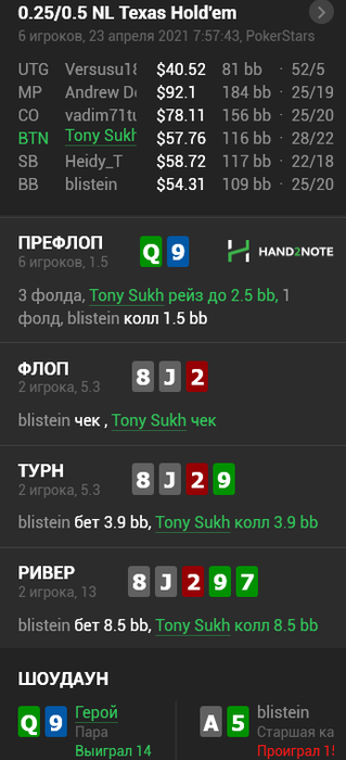 Оба сыграли как обезъяны, но судя по шд, опп изошёл на говно куда сильнее, а учитывая, что я мог сыграть так абсолютно с любым тузом старше, не говоря уже о сетах со старшими Ах доперами - и так же отбил бы по такой линии, - это могли быть отличные +50 в мой карман с дальнейшими бравадистыми воплями о том, что опп клоун. Как жаль, как жаль...