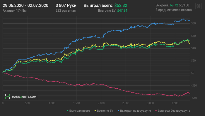 just_monkey, ну если на столько жёсткий в6+ с игрой без кешаута покажи график свой за все время, я лично начинал с нл2 быстро перешёл на 5ку и там уже понял что без кешаута дохуя теряю, потом перешёл на 10ку продолжая играть без кешаута и с евохой под 150-200 а профитом -100 я вернулся на нл2, начал гриндить с кешаутами когда необходимость в них есть и спокойно прошёл нл2-5 держусь на 10ке если бы не была нужда в выводах лавехи может и на 25ку уже перешёл бы.