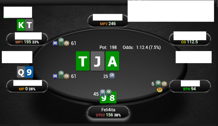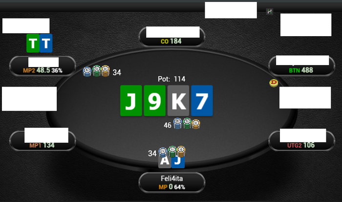 Все хорошо, но нам не дают выставиться с нашими 38% на выигрыш на флопе, но мы то уже знаем, что на флопе у нас точно 35% есть против 2ух диапазонов.