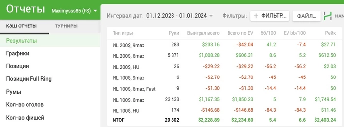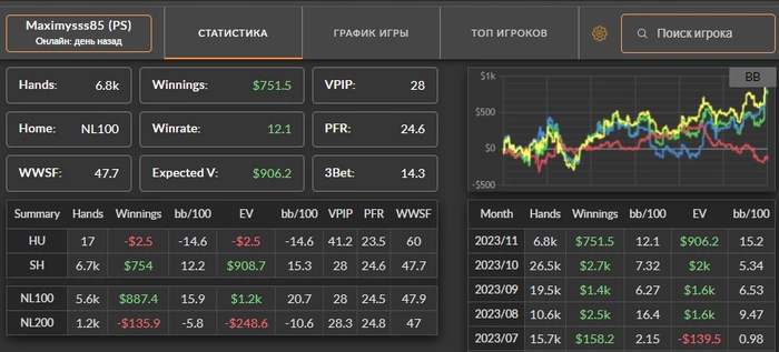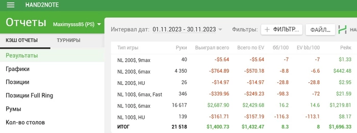 В ноябре я как и планировал занялся активно работой над стратегией, нашел кучу интересных вещей, ушел в это с головой работая по 5 часов в день вне столов и тестируя то что получилось вечером за столами, начал получать прикольные результаты и тут на самом пике когда я почувствовал что вот вот я докапаюсь до самой сути и найду покерный грааль у меня сгорает материнка, утром сгонял в магазин поставили новую мать + 32 гига новой оперативки (стало в итоге 64), сел запустил h2n и выяснилось что все программы начали жутко лагать либо вообще вылетать и показывать синий экран, в итоге сижу жду мастера видимо придётся сносить винду и дальше по новой устанавливать все программы, в общем пятничная катка мне походу не светит😒