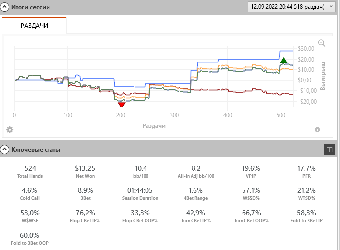 Хорошо что хоть минус не по ЕВ линий. Играл в целом плохо, плюс не особо заходило. Отдал 150бб в обічном поте вроде агрессивному оппу, н по такой линий блефов не будет на ривере. Дважды вколлил пот бет ривера проти фиша, в первой раздачи написал пот бет ривера велью, в второй просто вколлил его пот бет.