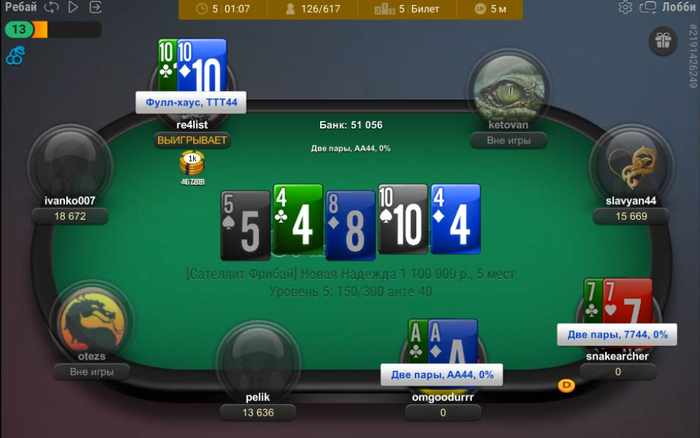 увы набирал стэк 300 и потом сразу вниз с АА ва банк при флопе и с 666 ва банк до флопа