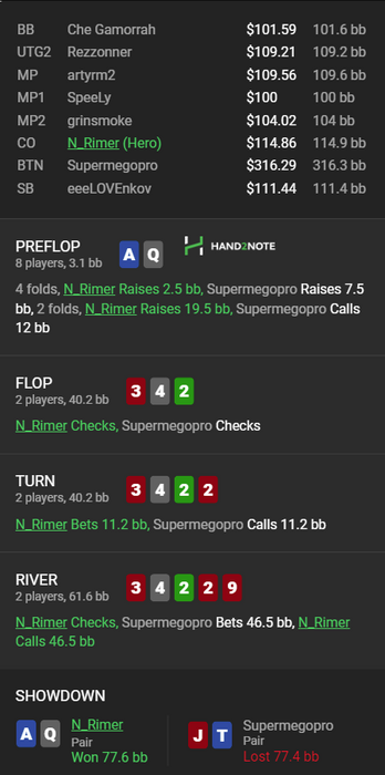 С ним пару раз зарубились, но мне там повезло, просто руки сильнее были, но была динамика. А потом случилась эта раздача. Очень доволен, что правильно оценил его диапазон.