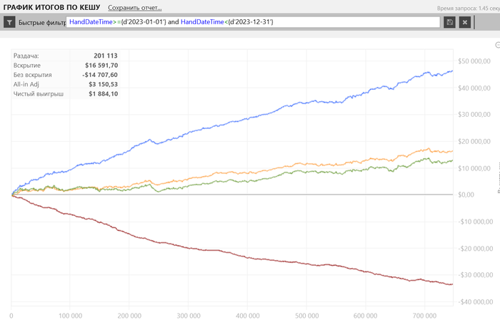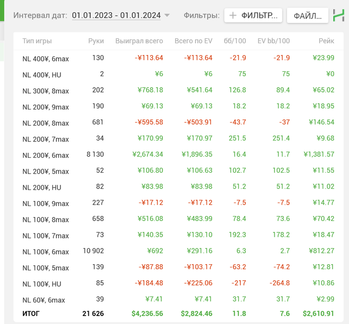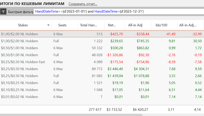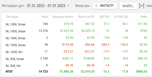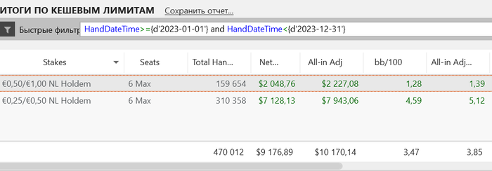 Основные румы по-прежнему - Ipoker и WPN. В Holdem Manager статистика идет уже с бомб-потами. Примерно выходило в среднем 500 рук/час. Отыграл около 1540 часов (в 2022 году было1360).
