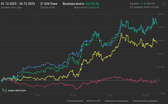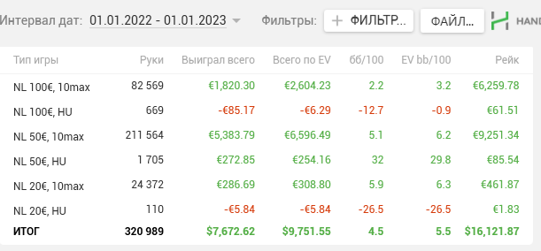 По покеру. На нл 200 не то что не закрепился, даже не заходил. Много денег приходилось выводить на кешауты для уплаты долгов. Постоянно спускался по лимитам, даже в начале декабря еще отыграл порядка 15к рук на нл 25. Также выплатил налоги за 2021-й год. В этом году рассчитываю все долги выплатить.