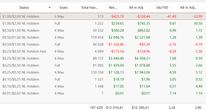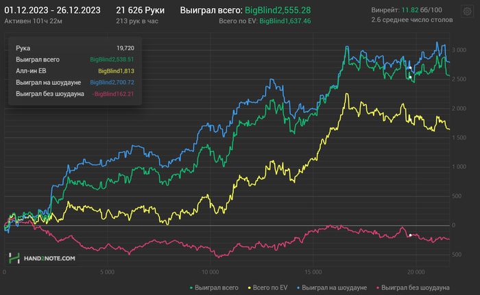 Сейчас играю миксом сети - Ipoker и WPN. За год получилось около 680к рук (бомб поты H2N не трекает), примерно выходило в среднем 500 рук/час. Отыграл на 400 часов меньше, чем в прошлом году (1360 против 1794). Пока тяжело даются Сх столы на WPN-е и бомб поты там же.