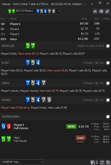 Кстати, у него блефа по риверу ещё меньше, чем у тебя по тёрну, и тем не менее ты его отколил