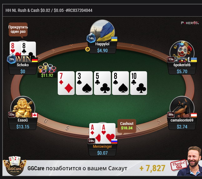 Разобраться бы еще, как тут всякие GGcare и GGcheers работают. Сегодня фулл хаусом с дамами проиграл фулл хаусу с тузами и ничего, а до этого 3 раза за стрит в стрит билет дали
